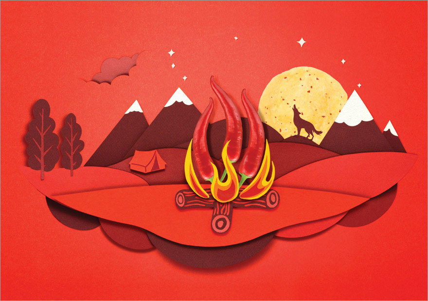 Popchips这个名字让我们创建了一个透视模型,在这个模型中,元素会随着光和阴影跳出页面。这后来成为该品牌的一个持续主题,并以弹出式书籍和显示器的形式扩展到销售点。我们给自己制定的规则之一是确保立体模型的场景总是有一个想法。为了盐&胡椒变体我们创建了一个风暴设置的分层卡。这个场景就像一场味道风暴,给你的薯条加了一点拉链。消费者将用胡椒磨粉机来识别该变体,因为它与变体名称相似。整个生产过程是无法在计算机上单独复制的。这幅纸的立体模型作品耗时500多个小时完成,被拍摄下来,拿到电脑上打印,然后用凹版印刷工艺打印出来。
